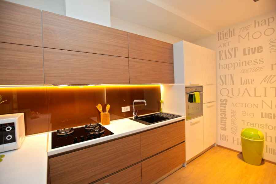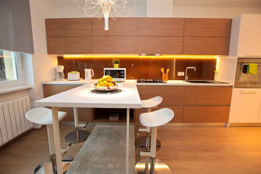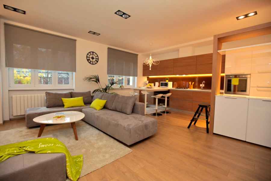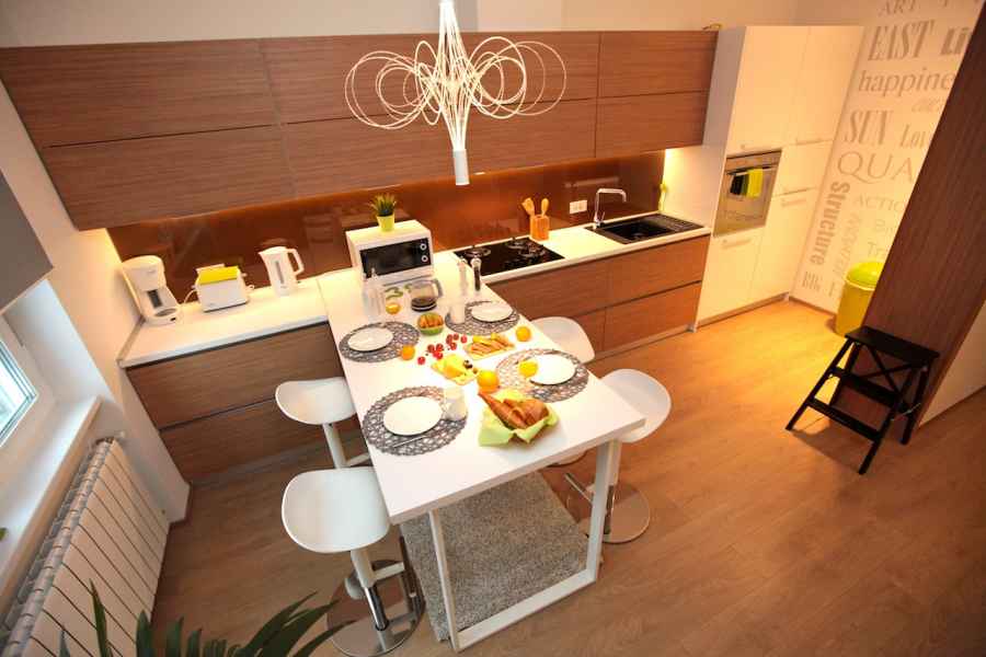 The apartment has everything you might need: for preparing food and drinks (refrigerator, oven, microwave oven, dishwasher, cooktop, electric water boiler, toaster and a coffee machine); for personal hygiene (walk-in shower, washing machine, hair dryer); or some important gadgets like 220V/110V power converter, drying rack, ironing board and a steam iron. In the living room there is a "Gemini" corner sofa, which thanks to its outstanding pull out system can be transformed into one double bed (160x200) or two separate single beds (80x200)